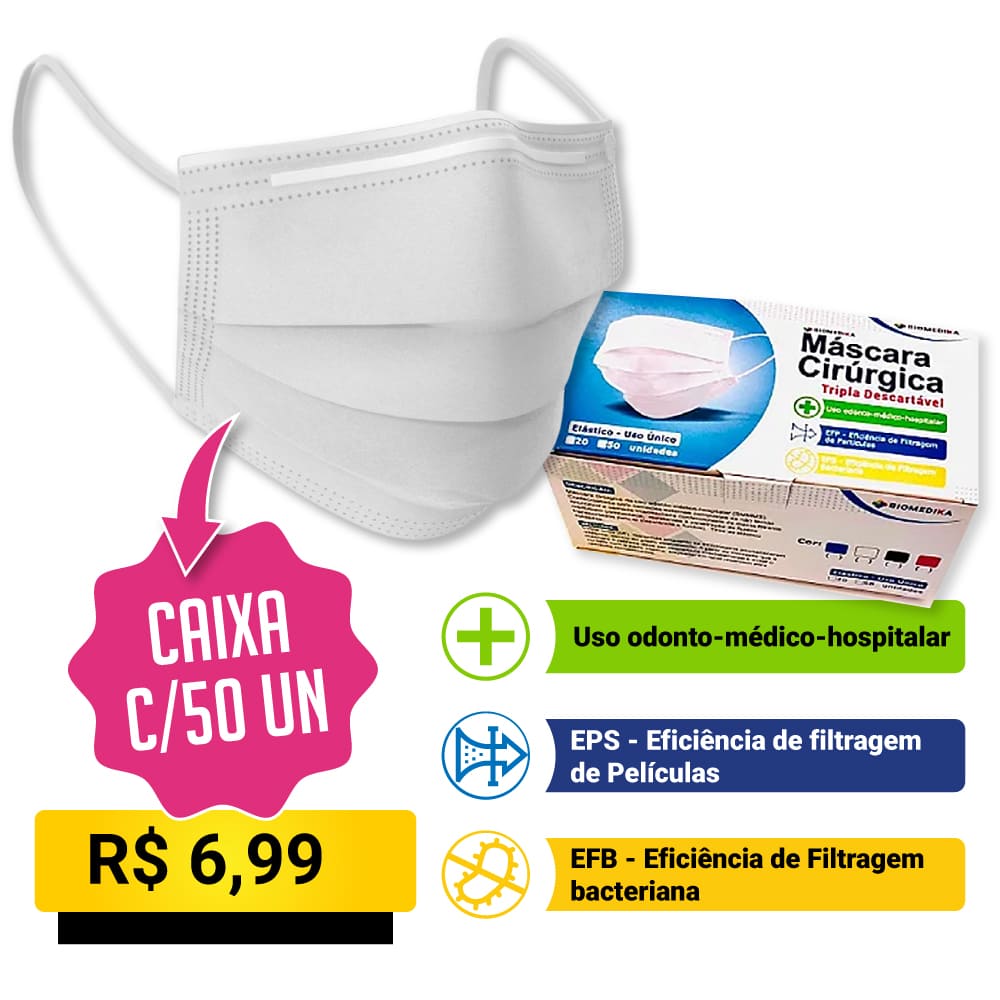 Máscara cirúrgica tripla camada com fixação por elásticos e clipe nasal.